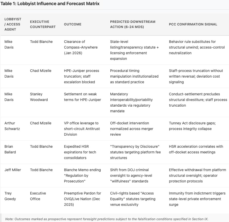 Chad Mizelle, DOJ Chief of Staff, functions as the process gatekeeper—controlling agenda routing, memo timing, and staff escalation pathways. The Alford testimony identifies Mizelle as the mechanism through which access converts to outcome without written reversal, enabling front-office decisions to bypass the evidentiary record. Arthur Schwartz leveraged ties to the Vice President's office to short-circuit Antitrust Division review on HPE-Juniper, reportedly omitted from Tunney Act disclosures required for consent decree transparency. Trey Gowdy, former prosecutor and lobbyist, secured direct presidential access through a golf outing (November 16, 2025); the simulation forecasts this channel as the pathway for a preemptive pardon for OVG/Live Nation—which would be the first preemptive pardon in criminal antitrust history.