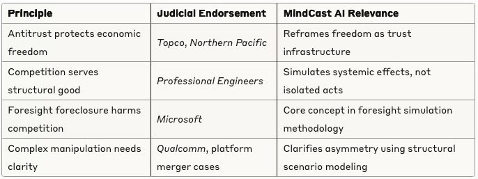 Key precedents like Topco, Professional Engineers, and Microsoft show courts grappling with non-price harms—including innovation suppression and cognitive asymmetry. Decades of rulings embed recognition of antitrust's role in preserving future-facing competition. MindCast AI renders latent judicial values modelable through structured prediction.