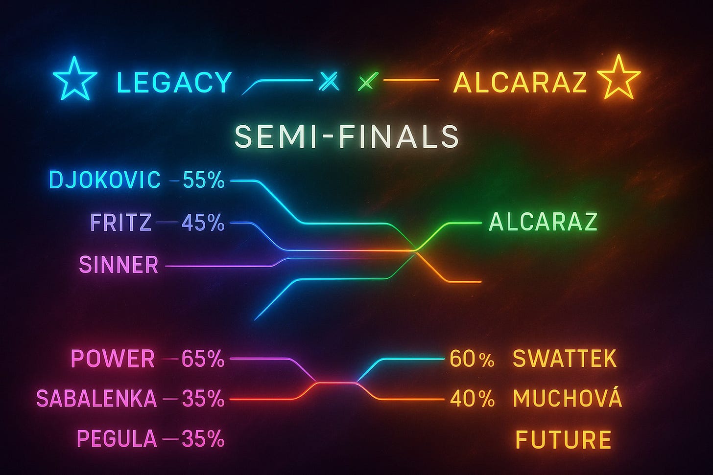 Alcaraz vs. Djokovic/Fritz asks: does the future belong to synthesis or to legacy under siege? Sinner vs. de Minaur is continuity versus disruption that has learned endurance. Sabalenka vs. Pegula pits scale against synthesis. ĹwiÄ