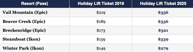 Holiday-period lift ticket prices at Colorado destination resorts tell the same story. Between 2019 and 2025, single-day peak prices at every major Epic and Ikon resort rose between 60% and 90% — well in excess of inflation, and consistent with penalty pricing rather than market-clearing.