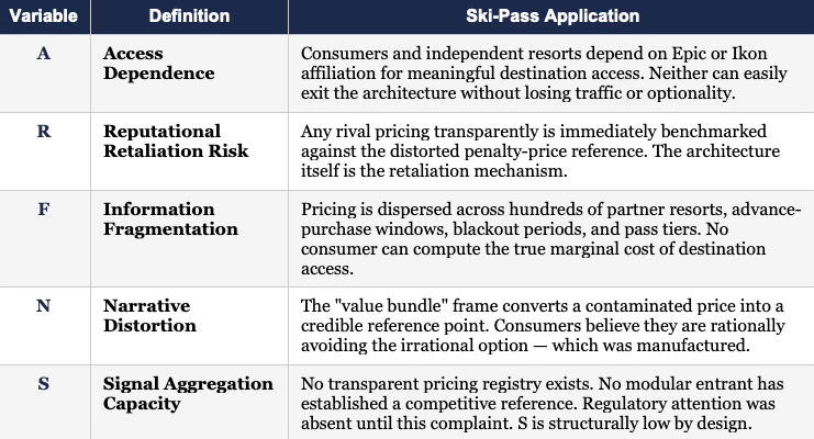 The case is most important as a Signal Suppression Equilibrium test. Two firms, using the market power concentrated in destination resort access, engineered a pricing architecture that eliminated the informational substrate on which price competition depends. Day-ticket prices stopped measuring demand and started measuring the cost of refusal. The bundle appeared rational not because it was efficient but because the alternative was made deliberately irrational.