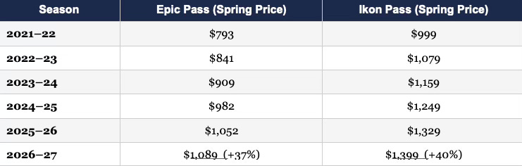 The result is parallel escalation without communication. Epic Pass prices have risen 37% since the 2021-22 season. Ikon Pass prices have risen 40% over the same period. No price-fixing agreement is required to produce that pattern — each firm observes the other’s outcomes through market data and adjusts within an architecture that rewards escalation and punishes transparency.