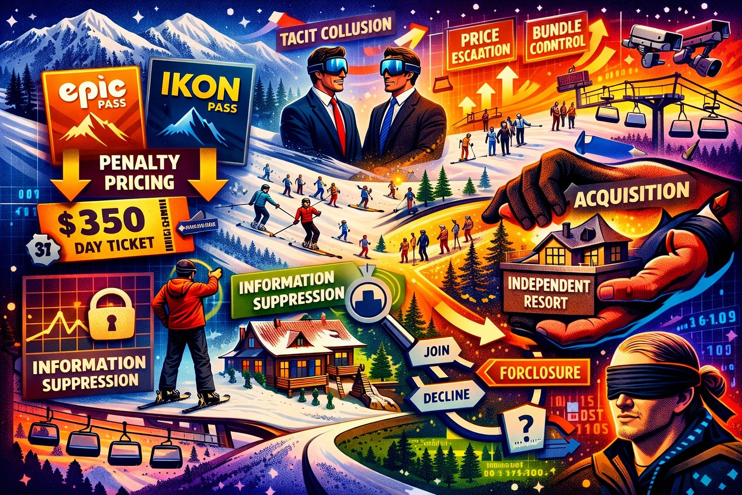 A class action complaint filed March 23, 2026 in the District of Colorado names Vail Resorts and Alterra Mountain Company as defendants in a ski-pass antitrust case. Read on its surface, the complaint targets tying and bundling — the familiar claim that linking access to destination resorts with access to regional ski areas forecloses competition. That framing is legally useful but analytically incomplete. The penalty price Vail Resorts and Alterra deployed suppresses the institutional signal, not just consumer search. The deeper architecture is something MindCast has formally theorized: a Signal Suppression Equilibrium (SSE). The firms did not merely make the bundle attractive. They made the outside option informationally useless. Once the day-ticket price stopped revealing demand and started disciplining refusal, competition moved from price discovery to architecture control.
