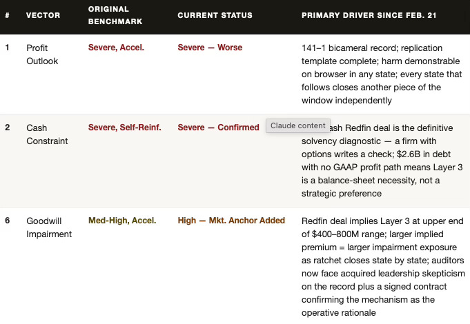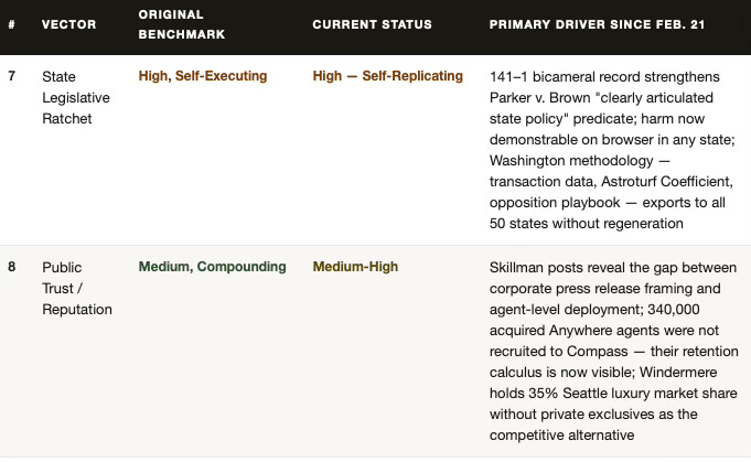 Vectors 7 and 8 were in the original February 21 framework. Both have worsened. The state legislative ratchet was always self-executing — the Redfin deal made it self-replicating by converting the harm from a theoretical argument into something demonstrable on a browser in any state capital. The reputational vector was always a lagging indicator — the Skillman posts moved it from abstract brand risk to documented agent-level conduct, with a named competitive alternative already operating at 35% luxury market share without the mechanism Compass is defending.