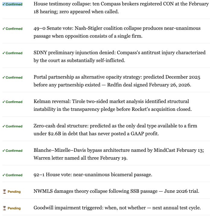 Vector 6 in detail. MindCast’s original framework estimated the Layer 3 private exclusive infrastructure premium at $400–800 million of the $1.6 billion Anywhere acquisition price. The Redfin deal adds a market-implied valuation anchor the original framework lacked. If Rocket’s $1.75 billion acquisition of Redfin was premised on Compass’s exclusive listing inventory as the primary driver of partnership value — which the press release structure strongly implies — the market is pricing Layer 3 at the upper end of the range. A larger implied premium means a larger impairment exposure when the regulatory ratchet closes the window state by state. Auditors testing the goodwill assumptions recorded at close now face three compounding facts simultaneously: acquired leadership skepticism on the record, a signed contract confirming the mechanism as the strategic rationale, and a state legislative ratchet eliminating the operating condition the premium requires. The impairment question is when — not whether.