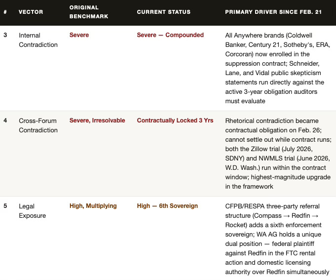 Vectors 3, 4, and 5 are downstream of Compass’s own filings, statements, and contracts being used against it across simultaneous proceedings. Anywhere’s leadership publicly doubted the private exclusive model before the merger closed — that skepticism is now auditor-facing evidence. Compass’s federal complaints argued that restricted listing visibility harms consumers — that argument now runs directly against the Redfin contract Compass signed. Five separate legal proceedings draw from the same evidentiary substrate, and each new sworn statement in any one of them narrows the factual space available in every other.