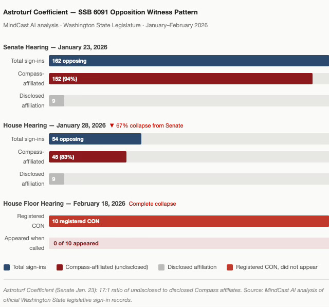 MindCast AI’s analysis of the January 23, 2026 Senate hearing documented 162 individuals opposing SSB 6091. Of those, 94% were Compass-affiliated. Only 9 disclosed that affiliation. The ratio — 17 undisclosed Compass affiliates for every 1 who disclosed — defines what MindCast formalized as the Astroturf Coefficient: a metric measuring the ratio of manufactured legislative signal to genuine constituent concern. Between the Senate and House hearings, Compass-affiliated sign-ins collapsed 67% — from 162 to 54 — as the disclosure pattern became visible to committee staff and the bill’s sponsors.