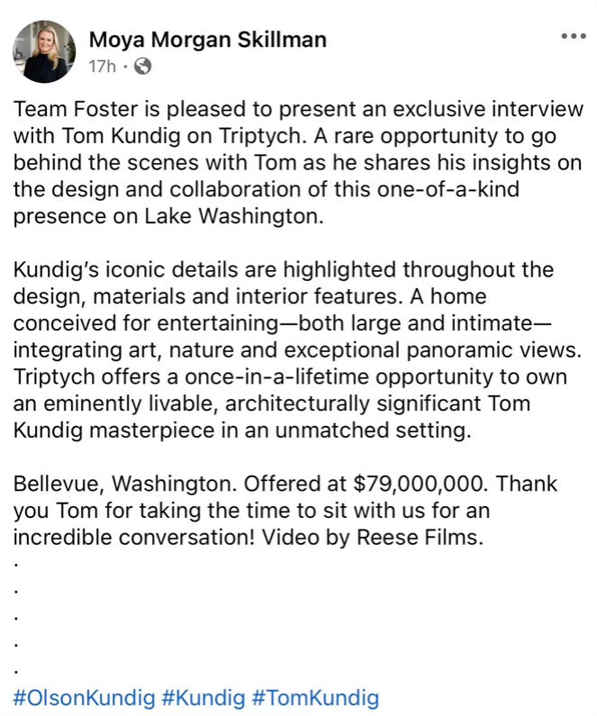 Skillman markets MLS #2392995 — the $79 million Lake Washington estate documented in the Address Suppression Calculus as Team Foster's anchor suppression listing — through an exclusive architect interview designed to generate internal buyer inquiry before broad market exposure. Public Facebook post, February 26, 2026.