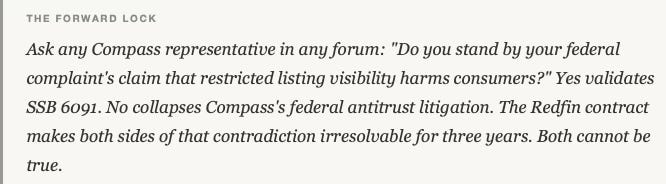 Ask any Compass representative in any forum, at any stage of the post-passage circumvention effort: “Do you stand by your federal complaint’s claim that restricted listing visibility harms consumers?” Yes validates SSB 6091. No collapses Compass’s federal antitrust litigation. The Redfin contract makes both sides of that contradiction irresolvable for three years. Both cannot be true.