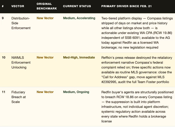 Vectors 9, 10, and 11 did not exist on February 21. All three emerged from the Redfin partnership announcement. None require SSB 6091 to take effect, none require federal cooperation, and none require a new statute. Vector 9 is actionable today under existing Washington CPA law. Vector 10 became available the moment Reffkin’s press release destroyed the retaliatory enforcement narrative. Vector 11 operates across every state where Redfin holds a brokerage license — independently of anything happening in Washington.