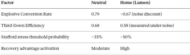The Ramsā 52ā54% neutral-field edge rests on a specific offensive sequence: early explosive conversions that establish rhythm before Seattleās defense can layer pressure. Home field doesnāt add atmosphereāit degrades the precise metrics that sequence depends on.