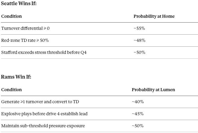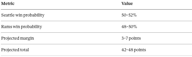 If Seattle reaches the third quarter tied or trailing narrowly, the game remains structurally favorable. If Seattle trails by more than one score, the Ramsā offensive ceiling becomes harder to contain.