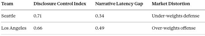 Markets price expectations based on available narratives, which often lag structural reality. Disclosure Vision measures the gap between what teams actually are and what consensus believes them to be. Significant latency gaps create value for observers who have calibrated against deeper system analysis.