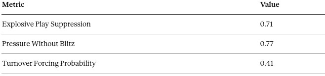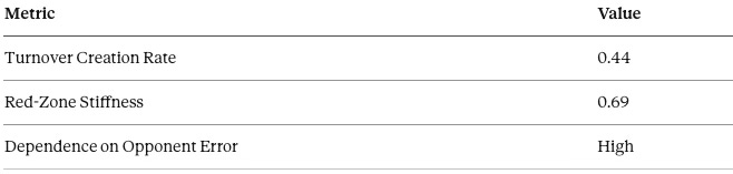 When explosives donāt hit, the Rams must sustain drives through the middle of the field. Their Disruption Sensitivity (0.63) indicates moderate vulnerability to accumulated pressureāenough to stall drives that would otherwise convert.