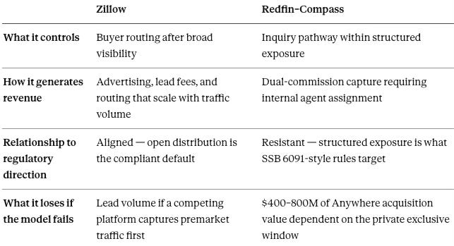 The Redfin alliance is Compass’s attempt to resolve that incompatibility by distributing the exposure mechanism across a partner platform rather than concentrating it internally. Redfin–Compass does not reject visibility. It restructures visibility to preserve timing advantage, information control, and lead routing priority. Whether that restructuring survives SSB 6091-style rules in the states where Compass holds significant listing share is the operative question.