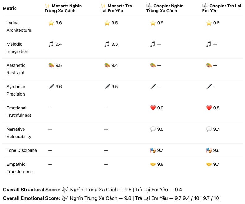 These songs not only resonate emotionally but reveal how music can function as an emotional blueprint, encoding values, relationships, and memory into melodic form. To better understand why Nghìn Trùng Xa Cách and Trả Lại Em Yêuendure, I assessed each using five dimensions drawn from years of interdisciplinary analysis now encoded into my AI system. These dimensions reflect how music teaches, remembers, and binds.
